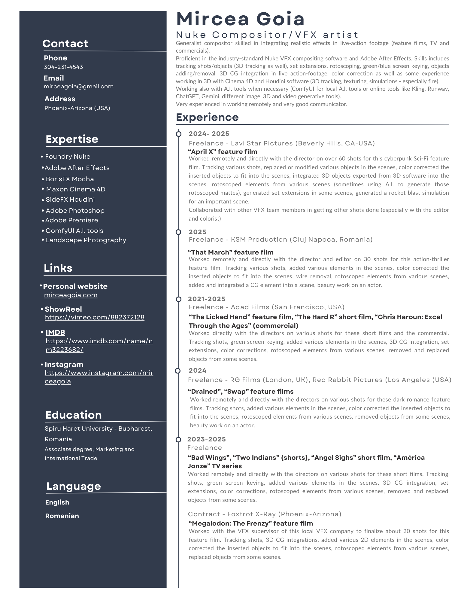 Proficient in the industry-standard Nuke VFX compositing software and Adobe After Effects. Skills includes tracking shots/objects (3D tracking as well), set extensions, rotoscoping, green/blue screen keying, objects adding/removal, 3D CG integration in live action-footage, color correction as well as some experience working in 3D with Cinema 4D and Houdini software (3D tracking, texturing, simulations – especially fire).